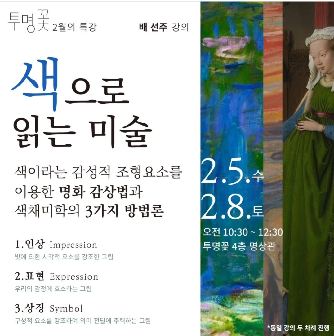 3, 4층으로 올라가면 미디어관과 갤러리가 있다. 그 곳에는 다양한 작가들의 전시가 열리기도 하고 인문학 강의가 두달에 한번 열린다고 한다. 다가오는 2월 5일, 8일에 강의가 있으며 투명꽃을 방문하여 케페테리아에서 알람 신청을 하면 전시소식과 강의소식을 문자로 받아볼 수 있다고 한다.