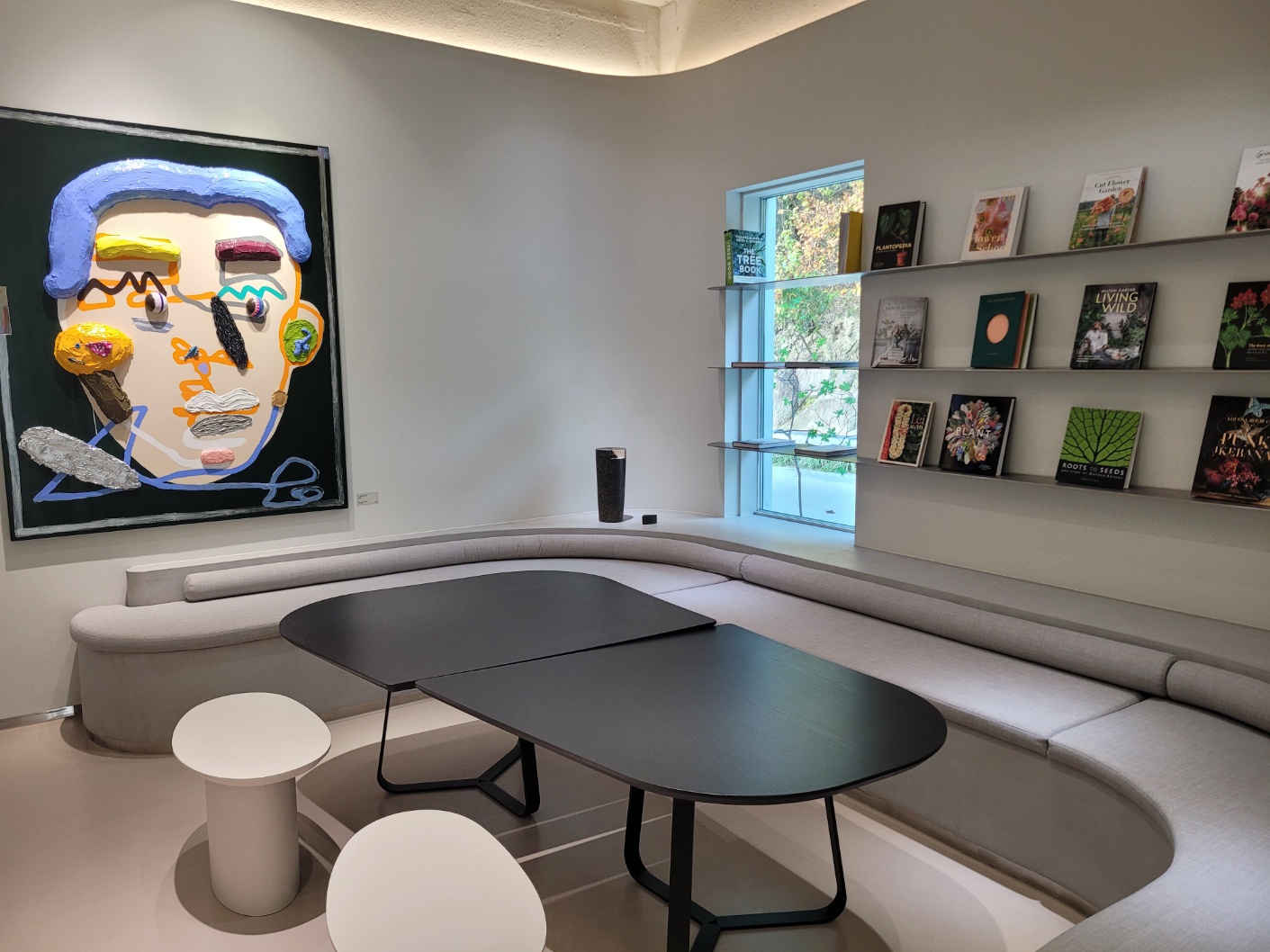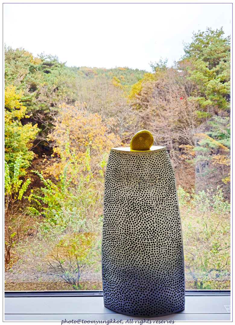 카페 위 계단으로 올라가면 커다란 공간에 도서관처럼 책장들이 펼쳐져 있다. 통창으로 된 벽 사이로 책들이 구비되어 있고 그 사이사이에는 다양한 작품들이 자리잡고 있다. 투명꽃에서 가장 눈여겨 볼 만한 것은 야외 정원과 건물 내부에 설치되어 있는 예술품들이다. 장소 특성을 고려한 조각작품과 공예, 회화작품들을 전시하고 있어서 고요한 저수지를 바라보며 쉼이라는 단어가 절로 나올 만큼 편안한 풍경 속에서 책과 예술을 즐기기에 안성맞춤이다.