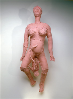 부르주아는 노년기에 들어서 바느질을 하기 시작합니다. 아마도 태피스트리를 수선하던 유년기의 기억이 큰 작용을 하였을 것으로 보입니다. 바느질 작업은 그녀에게 남편의 외도를 지켜보며 인내해야만 했던 어머니의 상처와 죽음에 대한 기억을 떠올리게 합니다. 역사적으로 바느질은 사회활동이 제한되었던 가부장적 시대의 여성에게 억압된 감정을 치유하고 창작의 욕구를 표출하는 도구가 되어왔습니다. 부르주아 역시도 바느질을 통하여 창작행위를 함으로써 과거의 어두운 기억과 고통을 되새기려는 의미가 있습니다. 그녀의 작품에 나타나는 여성과 남성의 신체 이미지 역시 자신의 기억을 낱낱이 끄집어내고 그것을 재경험함으로써 상징적으로 아픔을 치유하는 과정의 일부라 할 수 있습니다. 이를 명백하게 보여주는 작품 <나를 버리지 마세요>는 조각난 헝겊으로 덮여 이리저리 실로 꿰매어져 있는 막 출산한 여성의 형상을 표현하였습니다. 갓 태어난 아기는 탯줄이 여성의 배꼽에 연결되어 마치 엄마의 몸의 일부인 것처럼 매달려 있습니다. 작품 속 여인은 자신의 어머니를, 또 탯줄에 매달린 아기는 자신을 형상화한 것으로, 어머니의 상처와 부재로 인하여 겪은 두려움과 공포를 표현하였습니다. 부루주아의 작업에는 유독 모성애와 관련된 것이 많은데 과거 어머니에 대한 기억을 재생하고 새로운 탄생과 탯줄로 연결된 관계에 대한 화해와 복귀를 희망하는 의미인 것 같습니다.