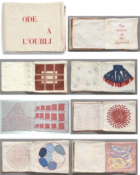 개인적으로 <망각의 시>라는 작품을 좋아합니다. 이 작품은 그녀의 자전적인 요소를 담아 한 권의 책으로 엮은 작품입니다. 총 36장으로 구성된 이 작품은 마치 그녀의 일기장을 펼쳐보는 듯한 느낌을 줍니다. 제목에서 느낄 수 있듯이 자신의 기억에서 오는 지난 상처들을 잊어버려는 의도에서 제작되었는데, 자신의 상처를 회피하지 않고 기억을 하나씩 꺼내어 가며 자신의 심리를 분석하고 자기 치유를 꾀하고자 하였습니다. 현재의 우리는 언제나 과거와 맞물려있기 때문에 그녀는 자신의 과거를 지우려면 과거와의 온전한 화해가 이루어져야 한다고 믿었습니다. 그녀에게 과거란 고통이고 공표였습니다. 그러나 이 작품에서는 과거의 작품과 같이 더 이상의 상처나 고통이 느껴지지 않습니다. 마치 어린이를 위한 동화책처럼 아기자기한 형상으로 된 패치워크처럼 보입니다. 이것은 그녀가 여전히 작품을 통해 과거를 환기하고 있지만. 그 속에서 카타르시스를 느끼고 자기 초월로 가고 있음을 의미합니다.