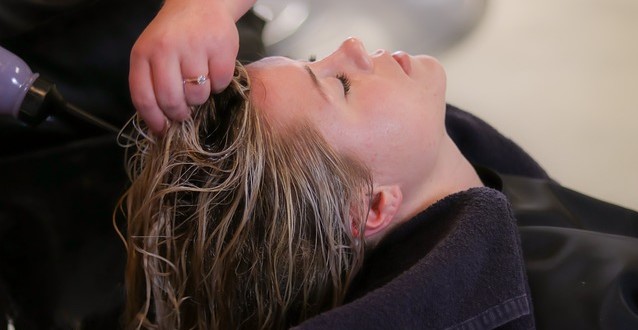 1. 머리를 감기위해 머리카락에 물을 적시고 손에 샴푸를 덜어냅니다.
