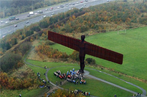 영국 게이츠헤드에 있는 ‘북방의 천사’(Angel of the Noth),1998 는 높이가 20미터이고 폭이 54미터에 달하는 거대한 크기의 기념비적인 조각상이다. 이 작품은 곰리의 작품 중 대중적으로 가장 잘 알려진 작품이기도 하다. 자연을 끌어안으려는 듯 두 팔을 벌린 어마어마한 크기의 인체 조각상인데 이 작품에도 곰리의 근본적인 미학적 태도가 묻어 있다. 대자연에 설치된 곰리의 조각은 자연과 인간 사이에 존재하는 거스를 수 없는 관계에 대한 표현이다. 경외감을 불러일으키는 이 예술 작품은 풍경과 상호 작용하여 웅장한 규모로 사색을 불러일으킨다.