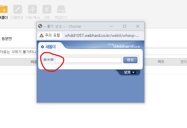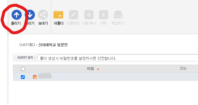 화면 상단에 새폴더를 클릭합니다. 그러면 아래와 같이 폴더이름을 입력하는 란이 나옵니다. 거기에 본인의 이름을 입력합니다. 저희는 동문전이니 전공 학번도 입력해줍니다. 예를 들어 "서양화95 김신라" 또는 대학원 학번일 경우 "대학원07 김신라" 이렇게 입력하신 후 "생성"을 클릭합니다. (교수님은 성함만 입력하시면 됩니다)
