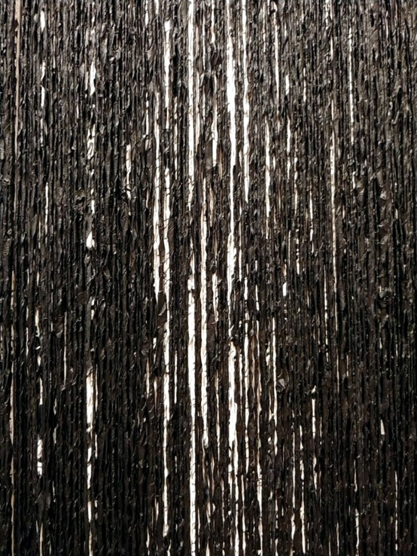한지에 붓 글씨를 쓴 후 1cm폭으로 잘라 한 가닥씩 손으로 꼬아 실을 만든다. 판넬에 접착제를 바르고 한지로 만든 실 한 가닥을 하나하나 붙여 나가는 과정을 반복한다. 한지에는 반야심경을 적어내려 가며 불자는 아니지만 ‘그리기’에 대한 욕구를 통제하듯 무심의 상태에 들어가 수행에 가까운 육체적 노력과 지구력을 수반한 작업을 한다.