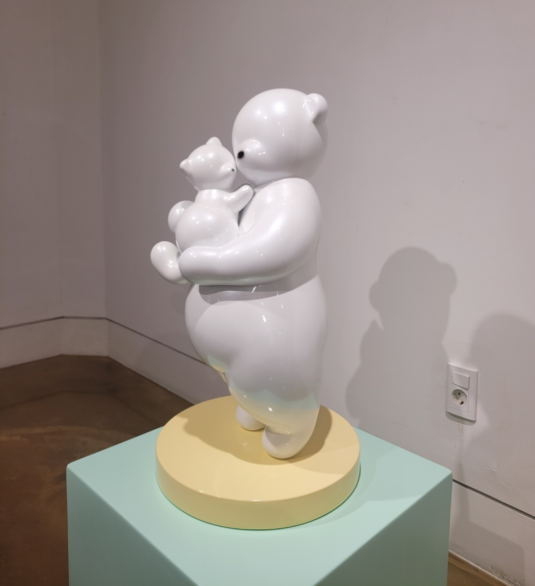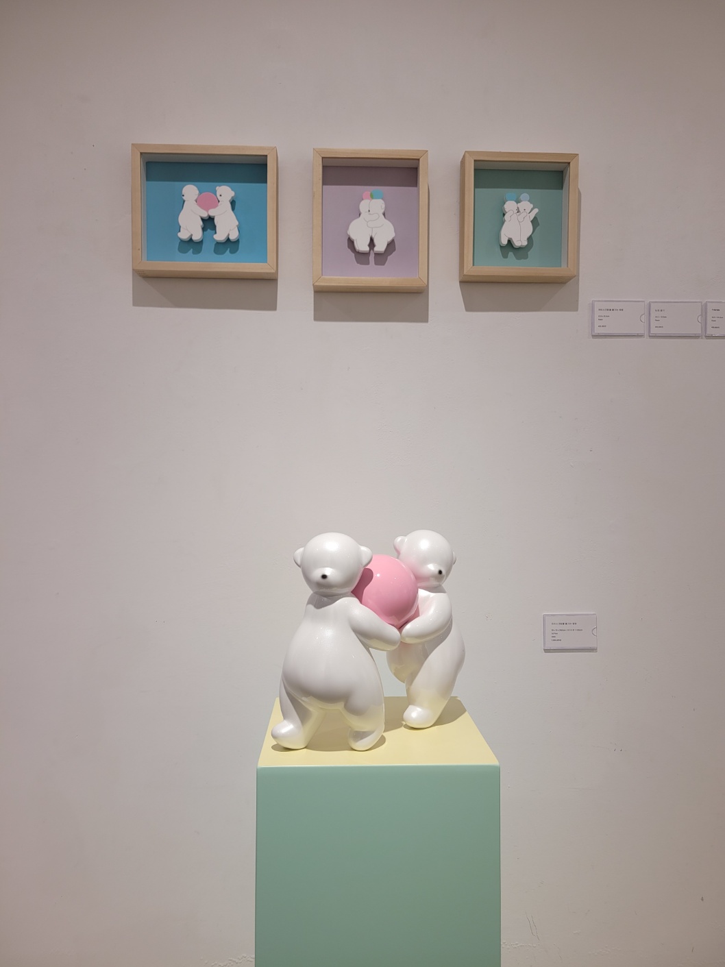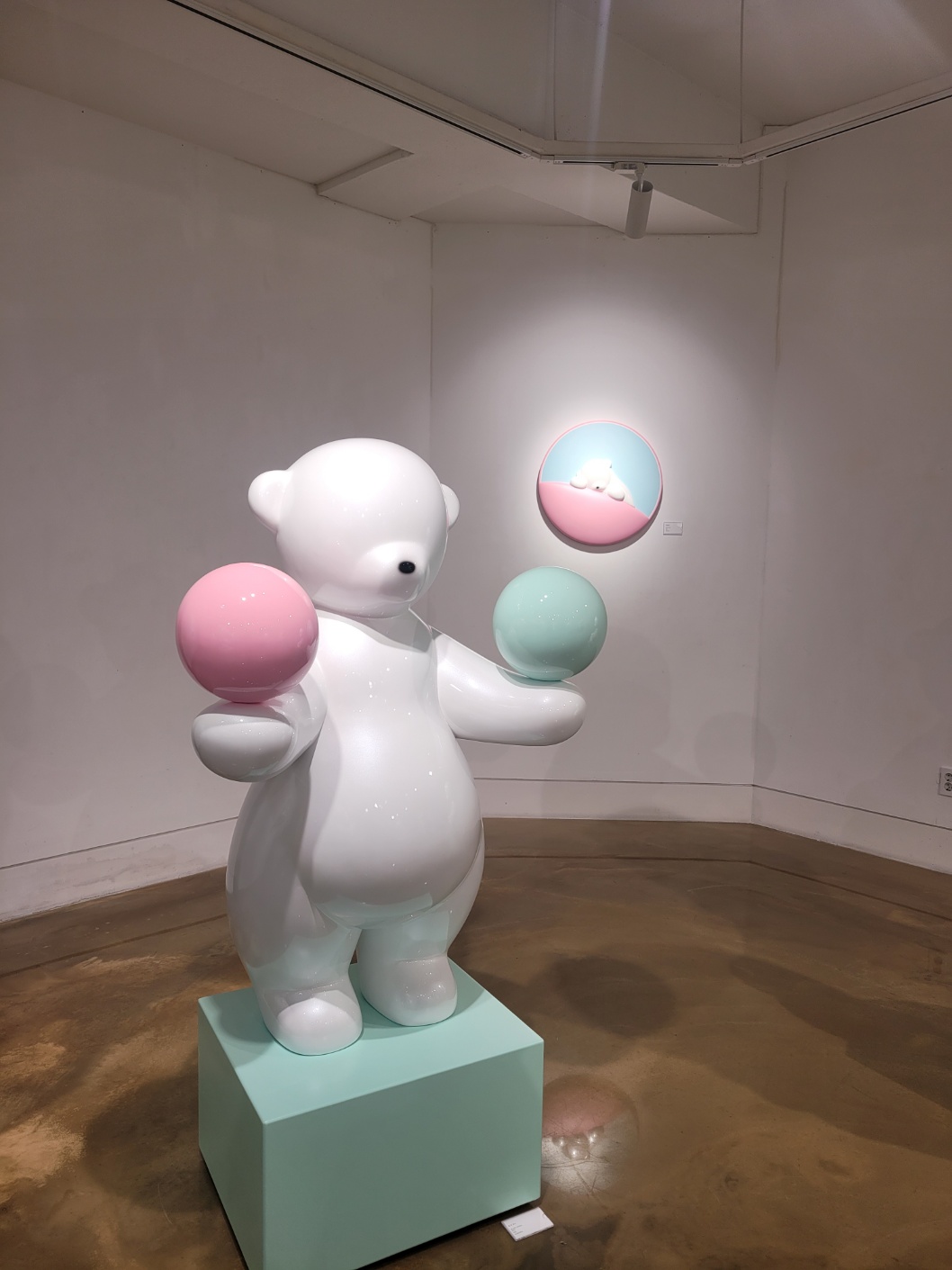 갤러리를 들어서자마자 가운데 홀에는 대략 1m~1.5m 의 큰 곰들이 아이스크림 공을 가지고 서커스를 하거나 또는 명상을 하는 듯한 모습으로 둘려쌓여 있는데, 이번 전시의 제목이 <너의 의미>인 만큼 스스로를 되돌아 보게 만들었다.