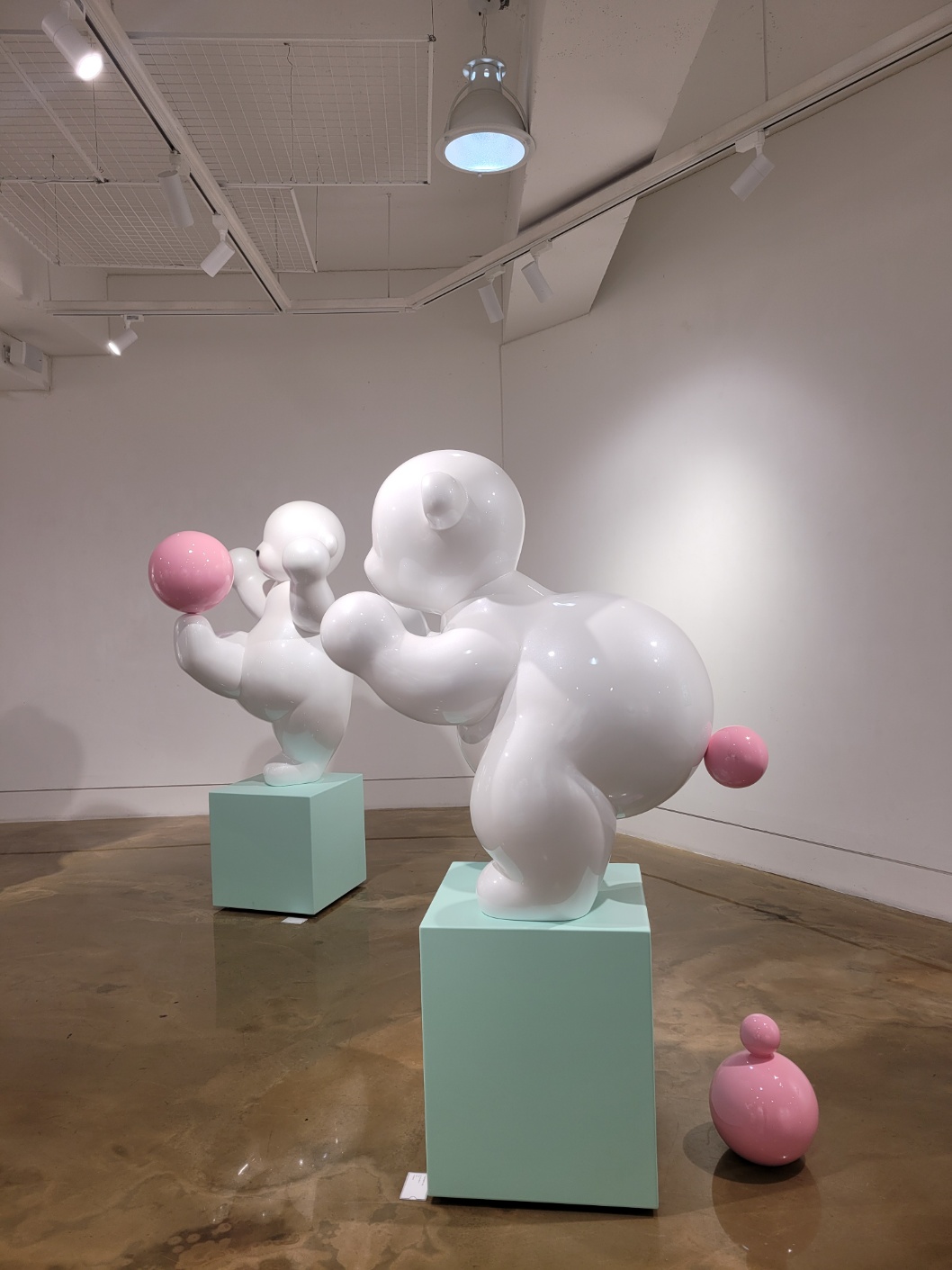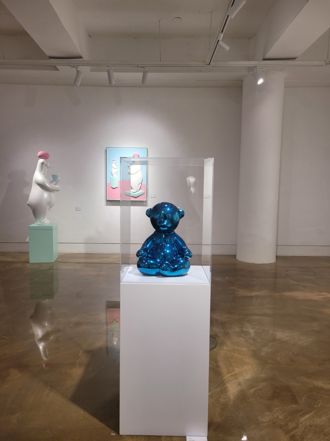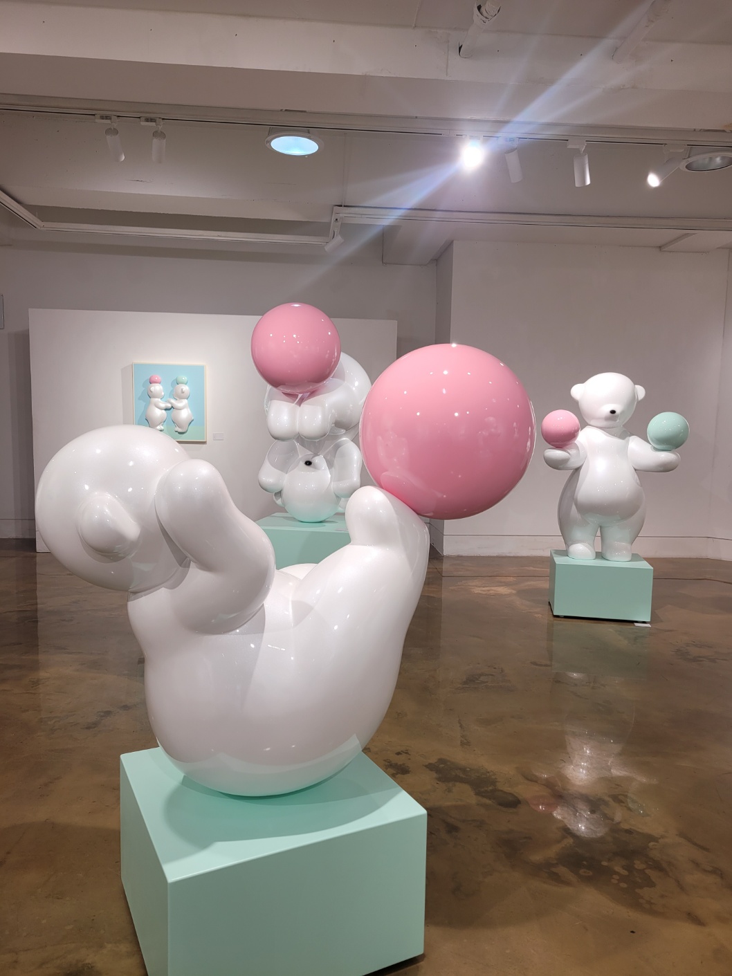 갤러리를 들어서자마자 가운데 홀에는 대략 1m~1.5m 의 큰 곰들이 아이스크림 공을 가지고 서커스를 하거나 또는 명상을 하는 듯한 모습으로 둘려쌓여 있는데, 이번 전시의 제목이 <너의 의미>인 만큼 스스로를 되돌아 보게 만들었다.