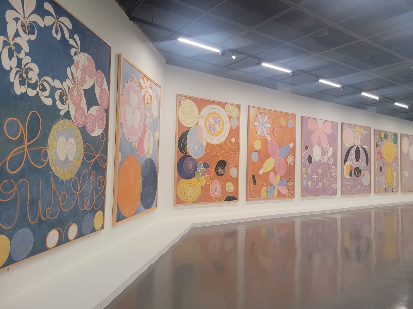 1907년에 제작된 <10점의 대형 그림>은 높이 약 3미터에 달하는 캔버스 열 점으로 이루어져 있으며 인간 생애의 네 단계를 주제로 구성되어 있다. 각각의 화면은 원, 나선, 곡선 등 자유로운 형상과 색채의 운동으로 가득 차 있으며 추상과 상징, 언어와 비언어적 흐름이 조화를 이루고 있다. 이 연작은 그녀의 형식 실험이 가장 극적으로 구현된 예시이자 이후 작품의 구성 방식을 예고한 결정적인 작업이다.