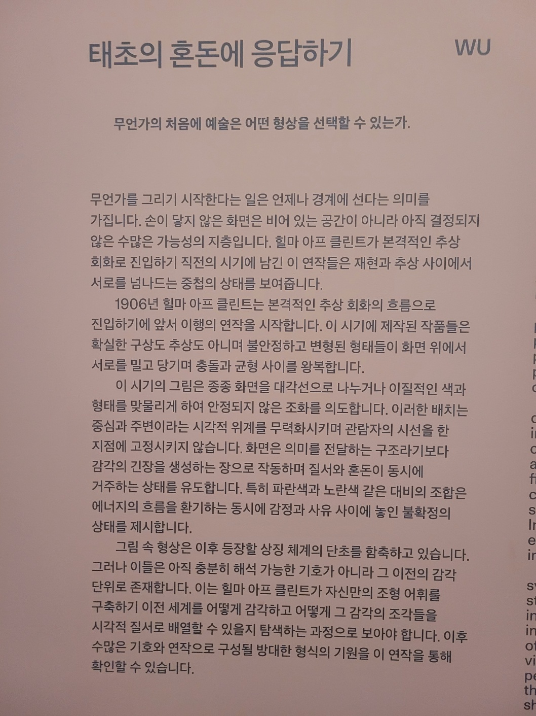 "힐마 아프 클린트는 거의 한 세기 동안 미술사에 호출되지 않았다......한때 미술사가 너무 일찍 도착했다며 외면한 그의 작업은 이제 너무 늦게 발굴한 천재라는 편협한 수사 속에서 반복적으로 소환되고 있다. 힐마 아프 클린트의 귀환이 진정한 의미를 가지려면 우리는 그녀의 작품이 소비되는 속도와 과잉된 관심을 조정하고 이 호출의 의미와 방향을 다시 점검해야 한다".