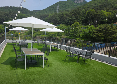 계단으로 올라가면 루프탑이 있는데 지금은 한 여름이라 더워서 올라가진 않았지만, 날씨가 서늘해지면 시원한 바람을 느끼며 초록빛 숲의 풍경을 한눈에 볼 수 있다. 밤에는 루프탑 파티를 열고 싶은 넓은 공간이 펼쳐져 있다.